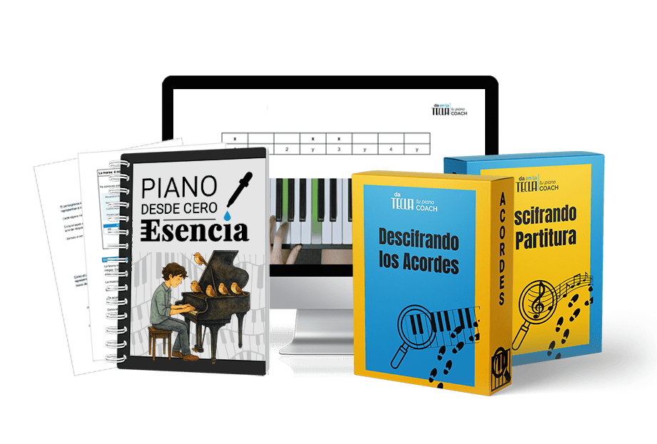 Cada canción estará demostrada directamente en vídeo sobre el piano, y luego tendrás los diagramas de colores y esquemas de ritmos en PDF como guía extra.